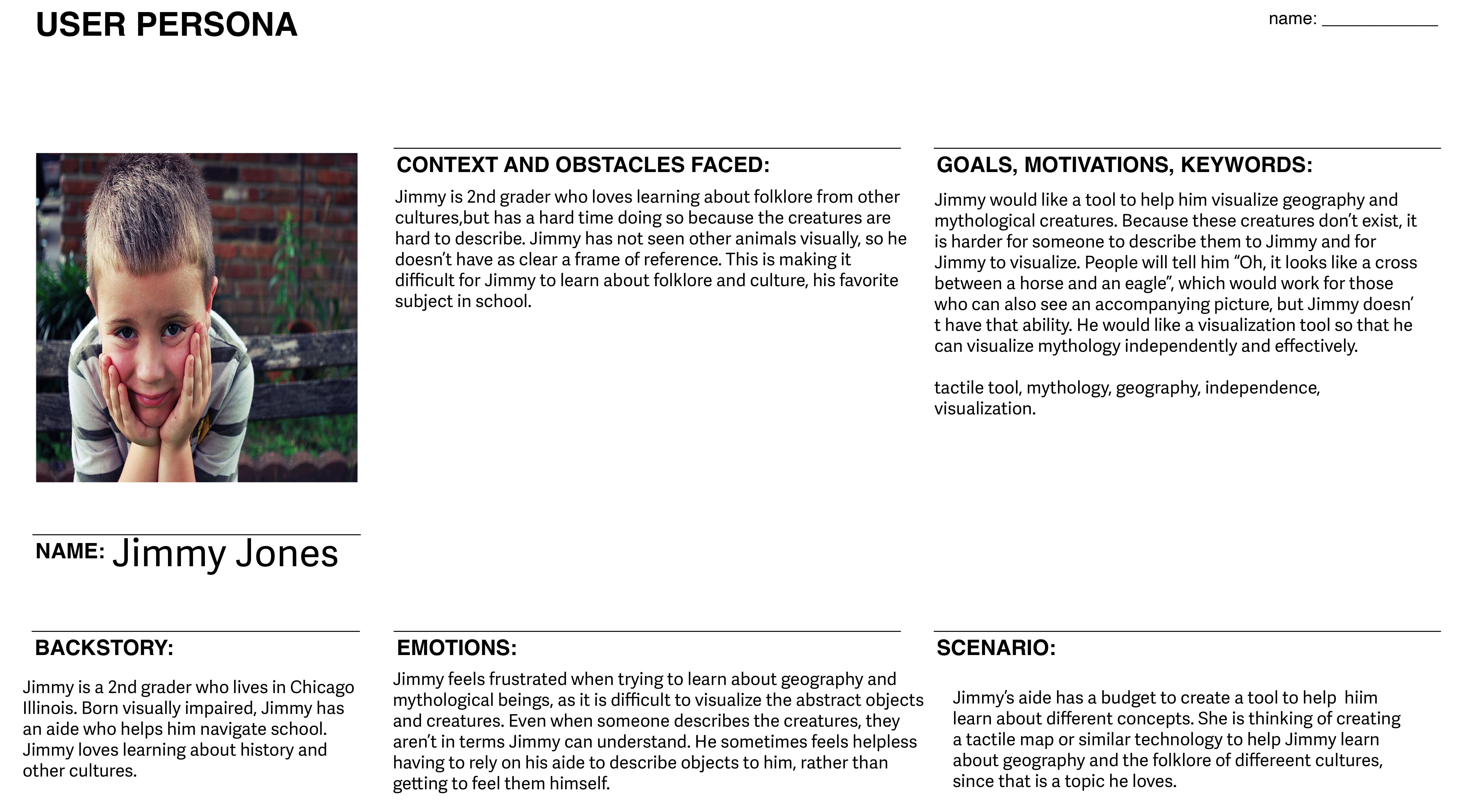 To help guide my process, I created a user persona, Jimmy. Jimmy is a visually impaired 2nd grader, who loves learning about folklore and other cultures I made my persona a child as I figured mythology is a topic that children might have trouble understanding, and I wanted my map to be educational. Since I am not vision impaired myself, it was important to keep in mind what a vision impaired person would need in a tactile map.