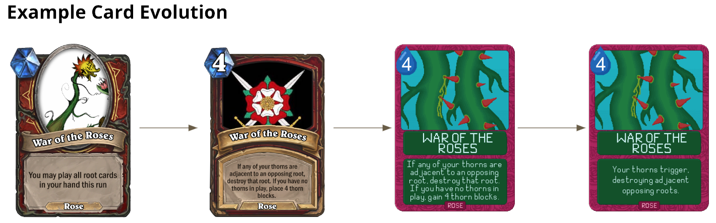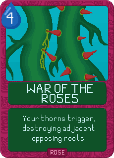 Following this change, I had war of the roses synergize with the thorn card, that was already implemented, as an expensive but big payoff. Further evolutions of the card were made to make the card text more concise and clear.